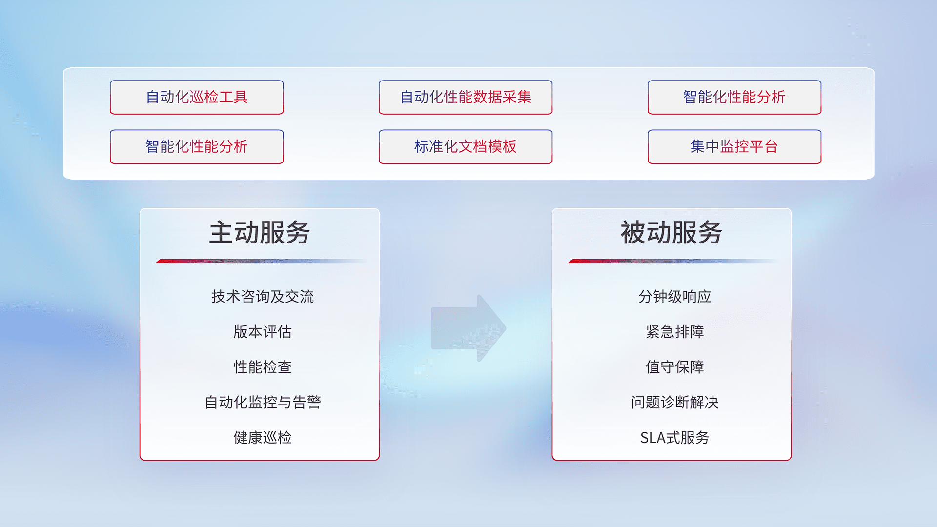 智能化工具和标准化文档,,,,保障服务质量,,,,提供主动服务(包含技术咨询、、、、版本评估、、、性能检查、、、、自动化监控与告警、、健康巡检)和被动服务包含(分钟级响应、、紧急排障、、、、值守保障、、问题诊断解决、、SLA服务)。。。。